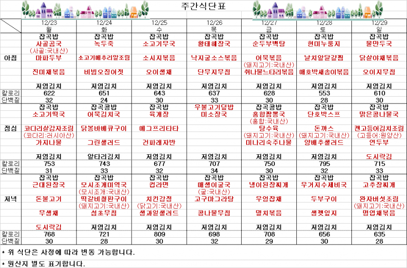 12월 4째주 주간식단표 페이지 정보 작성자 김선희 댓글 0건 조회 2,784회 작성일 24-12-20 13:54 목록 본문 ` 이전글12월 마지막주 주간식단표 24.12.27 다음글아름해든집 생활지도원 긴급 채용 24.12.18 댓글 0 댓글목록 등록된 댓글이 없습니다.