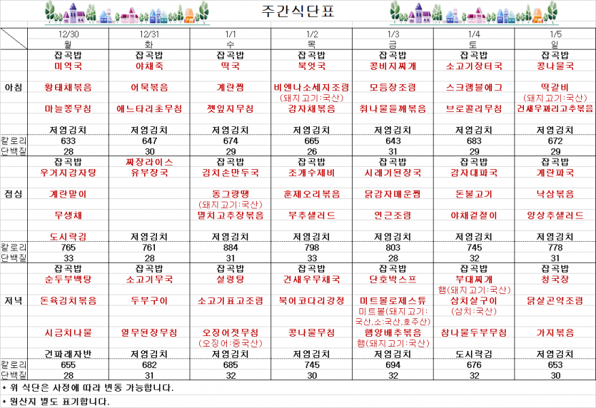 12월 마지막주 주간식단표 페이지 정보 작성자 김선희 댓글 0건 조회 2,704회 작성일 24-12-27 11:39 목록 본문 ` 이전글1월 1째주 주간식단표 25.01.03 다음글12월 4째주 주간식단표 24.12.20 댓글 0 댓글목록 등록된 댓글이 없습니다.