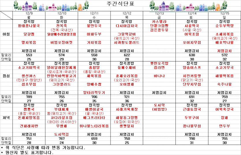 12월 2째주 주간식단표 페이지 정보 작성자 김선희 댓글 0건 조회 2,836회 작성일 24-12-06 09:01 목록 본문 13일(금)은 식당 조리실 보수공사로 조리가 불가 하여 부득이 대체 식으로 지원합니다. 이전글12월 3째주 주간식단표 24.12.13 다음글12월 1째주 주간식단표 24.11.29 댓글 0 댓글목록 등록된 댓글이 없습니다.