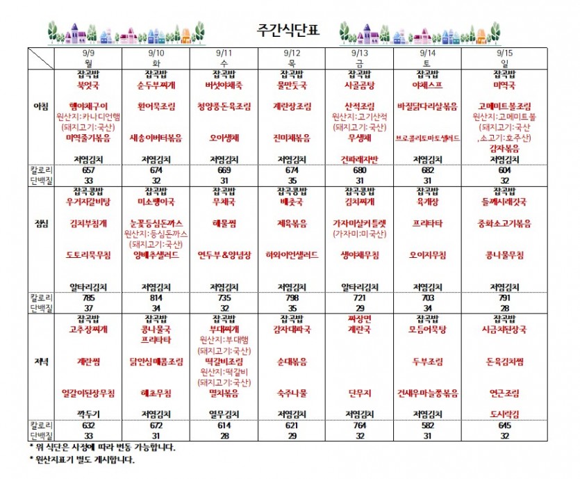 9월 2째주 주간식단표 페이지 정보 작성자 김선희 댓글 0건 조회 3,466회 작성일 24-09-06 08:14 목록 본문 ` 이전글2024년 7월분 아름해든집 후원금(물품) 수입 및 사용명세서 공개 24.08.15 다음글2024.08 아름해든집 업무추진비 공개 24.09.04 댓글 0 댓글목록 등록된 댓글이 없습니다.