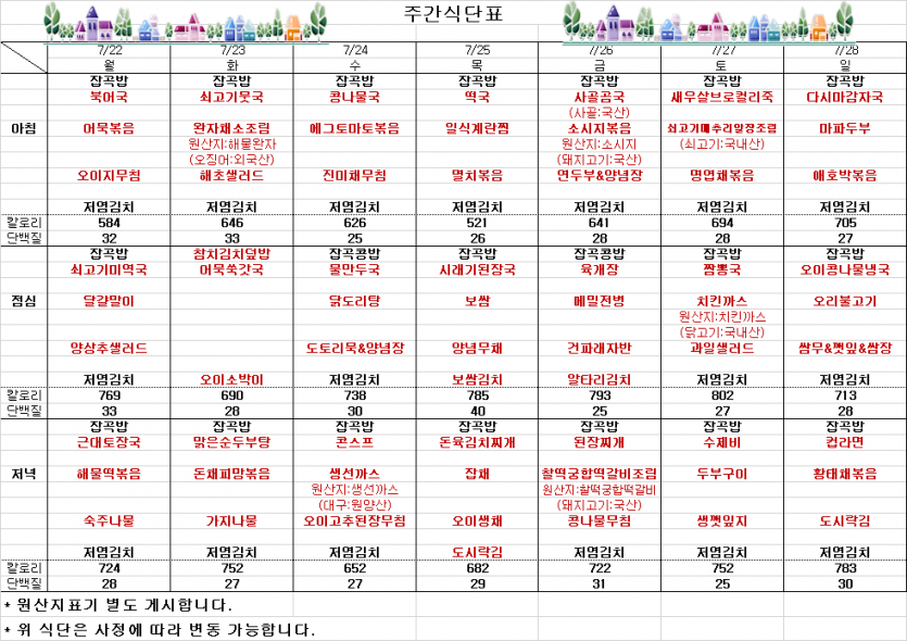 7월 4째주 주간식단표 페이지 정보 작성자 김선희 댓글 0건 조회 3,787회 작성일 24-07-19 11:07 목록 본문 ` 이전글7월 마지막주 주간식단표 24.07.26 다음글7월 3째주 주간식단표(변경) 24.07.15 댓글 0 댓글목록 등록된 댓글이 없습니다.