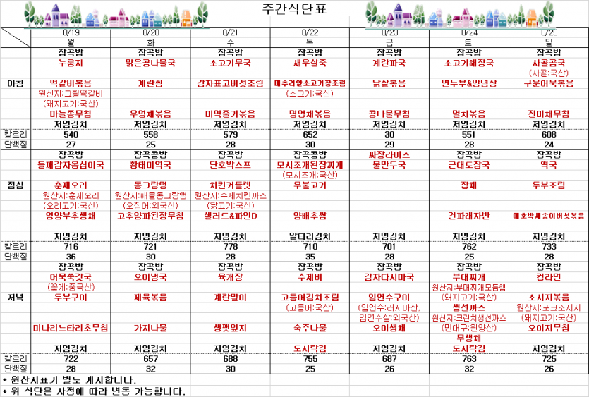 8월 3째주 주간식단표 페이지 정보 작성자 김선희 댓글 0건 조회 3,670회 작성일 24-08-16 09:26 목록 본문 ` 이전글1차 서류 합격자 발표 24.08.16 다음글8월 월간계획서 24.08.06 댓글 0 댓글목록 등록된 댓글이 없습니다.