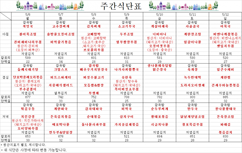 5월 1째주 주간식단표 페이지 정보 작성자 김선희 댓글 0건 조회 4,297회 작성일 24-05-03 13:13 목록 본문 ` 이전글5월 월간계획서 24.05.07 다음글4월 마지막주 주간식단표 24.04.30 댓글 0 댓글목록 등록된 댓글이 없습니다.