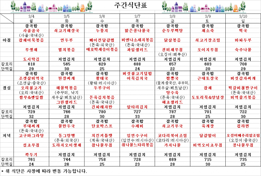 3월 1째주 주간식단표 페이지 정보 작성자 김선희 댓글 0건 조회 4,529회 작성일 24-02-29 14:13 목록 본문 ` 이전글2024.02 아름해든집 업무추진비 공개 24.03.06 다음글2월 마지막주 주간식단표 24.02.23 댓글 0 댓글목록 등록된 댓글이 없습니다.