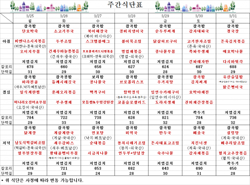 3월 마지막주 주간식단표 페이지 정보 작성자 김선희 댓글 0건 조회 4,407회 작성일 24-03-21 17:22 목록 본문 ` 이전글4월 1째주 주간식단표 24.03.29 다음글신바람 산바람 숲체험 일정 24.03.18 댓글 0 댓글목록 등록된 댓글이 없습니다.