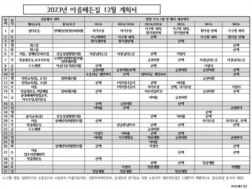 12월 월간계획서 페이지 정보 작성자 장은지 댓글 0건 조회 4,991회 작성일 23-12-02 09:20 목록 본문 12월 월간계획서 이전글2023년 7월분 아름해든집 후원금(물품) 수입 및 사용명세서 공개 23.08.13 다음글11월 월간계획서 23.11.01 댓글 0 댓글목록 등록된 댓글이 없습니다.