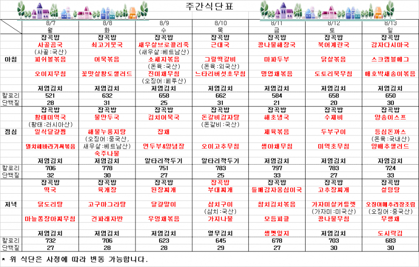8월 1째주 주간식단표 페이지 정보 작성자 김선희 댓글 0건 조회 5,628회 작성일 23-08-04 09:30 목록 본문 ` 이전글8월 둘째 주 식단표 23.08.09 다음글7월 마지막주 주간식단표 23.07.28 댓글 0 댓글목록 등록된 댓글이 없습니다.