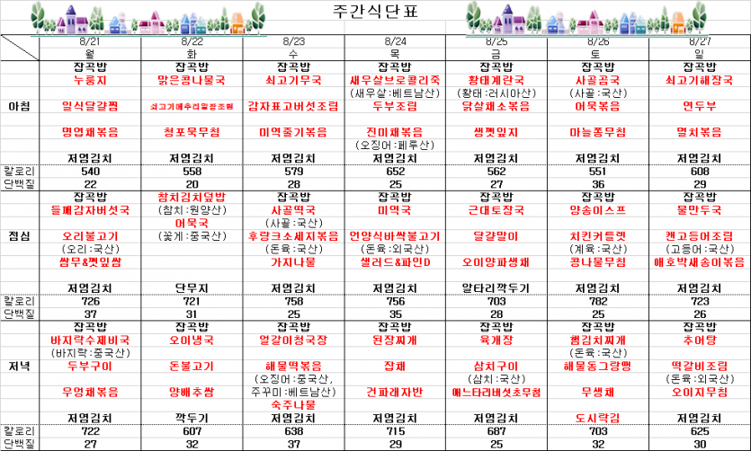 8월 3째주 주간식단표 페이지 정보 작성자 김선희 댓글 0건 조회 5,598회 작성일 23-08-18 11:40 목록 본문 ` 이전글8월 마지막주 주간식단표 23.08.25 다음글8월 둘째 주 식단표 23.08.09 댓글 0 댓글목록 등록된 댓글이 없습니다.