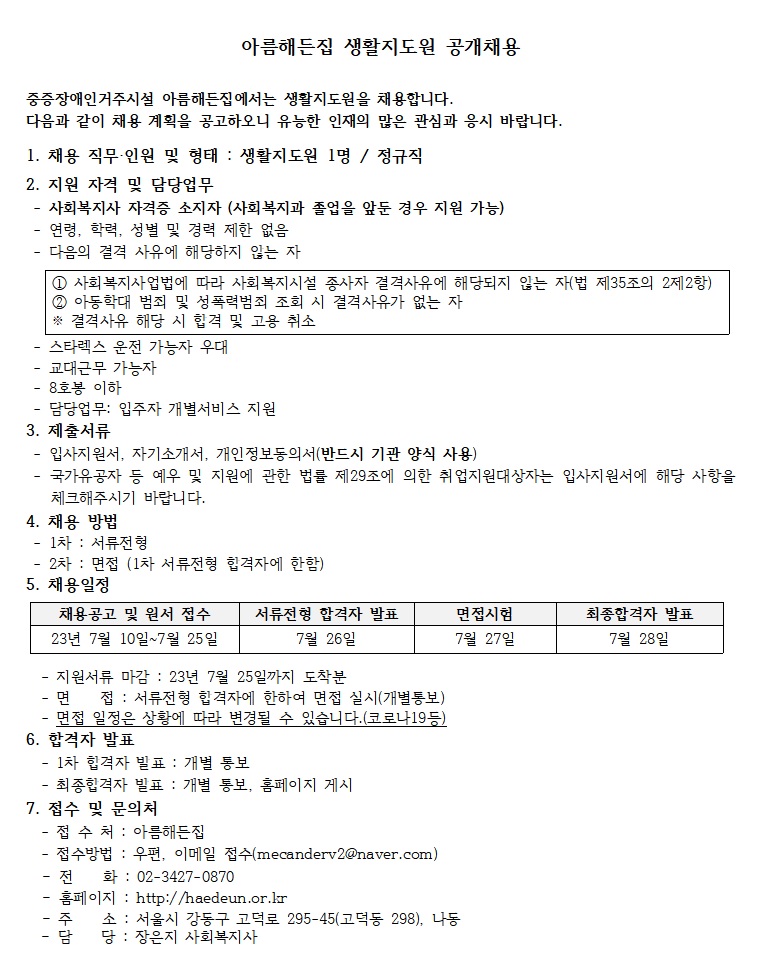 아름해든집 생활지도원 채용 공고 > 공지사항