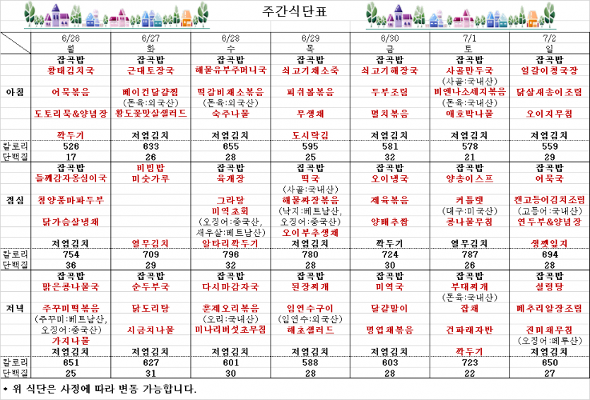 6월 마지막주 주간식단표 페이지 정보 작성자 김선희 댓글 0건 조회 5,789회 작성일 23-06-23 15:25 목록 본문 ` 이전글7월 1째주 주간식단표 23.06.30 다음글최종 합격자 발표 23.06.16 댓글 0 댓글목록 등록된 댓글이 없습니다.