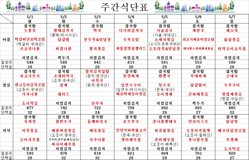 5월 1째주 주간식단표 페이지 정보 작성자 김선희 댓글 0건 조회 6,443회 작성일 23-04-28 15:22 목록 본문 ` 이전글5월 2째주 주간식단표 23.05.04 다음글생활지도원 채용 23.03.23 댓글 0 댓글목록 등록된 댓글이 없습니다.