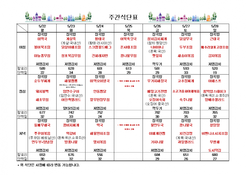 5월 4째주 주간식단표 페이지 정보 작성자 김선희 댓글 0건 조회 6,268회 작성일 23-05-22 08:26 목록 본문 ` 이전글2023년 4월분 아름해든집 후원금(물품) 수입 및 사용명세서 공개 23.05.11 다음글2023년도 제 1 차 사회복지현장실습 신청 안내 23.05.19 댓글 0 댓글목록 등록된 댓글이 없습니다.