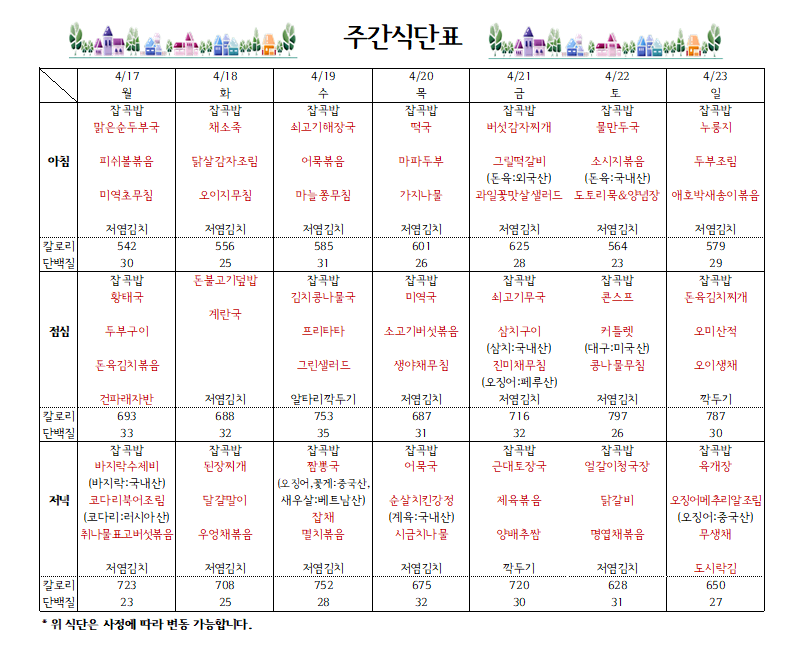 4월 3째주 주간식단표 페이지 정보 작성자 김선희 댓글 0건 조회 6,663회 작성일 23-04-14 16:16 목록 본문 ` 이전글1차 서류 합격자 발표 23.04.07 다음글언어재활사 채용 재공고 23.04.07 댓글 0 댓글목록 등록된 댓글이 없습니다.