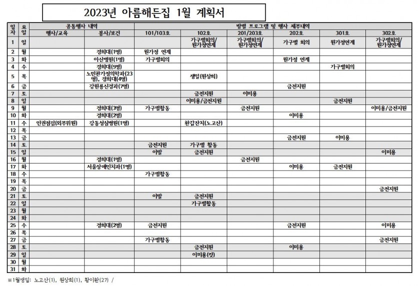 1월 월간계획표 페이지 정보 작성자 장은지 댓글 0건 조회 7,686회 작성일 23-01-04 16:39 목록 본문 1월 월간계획표 이전글1월 3째주 주간식단표 23.01.16 다음글2022.12 아름해든집 업무추진비 공개 23.01.09 댓글 0 댓글목록 등록된 댓글이 없습니다.