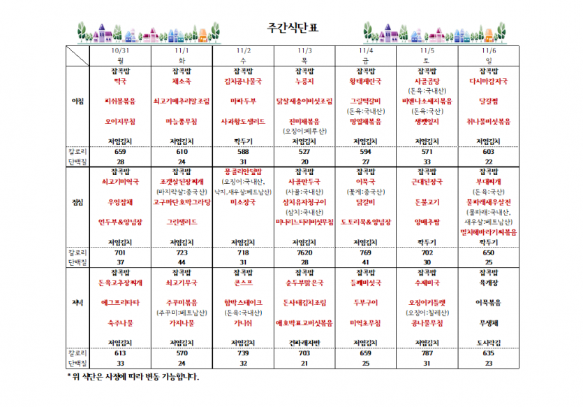 10월 마지막주 주간식단표 페이지 정보 작성자 김선희 댓글 0건 조회 9,577회 작성일 22-10-27 17:49 목록 본문 몽골리안 덮밥은 다양한 해산물과 숙주를 포함한 신선한 야채를 볶아 만든 퓨전 요리입니다. 이전글10월 4째주 주간식단표 22.10.24 다음글생활재활교사 1차 서류 합격자 발표 22.12.19 댓글 0 댓글목록 등록된 댓글이 없습니다.