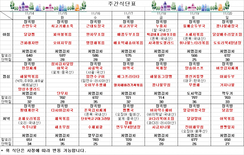 11월 2째주 주간식단표 페이지 정보 작성자 김선희 댓글 0건 조회 8,980회 작성일 22-11-11 10:50 목록 본문 15일에는 입주자 기호도 반영한 김치덮밥을 지원합니다. 이전글언어재활사 채용 재공고 22.11.18 다음글2022년 11월분 아름해든집 후원금(물품) 수입 및 사용명세서 공개 22.12.15 댓글 0 댓글목록 등록된 댓글이 없습니다.