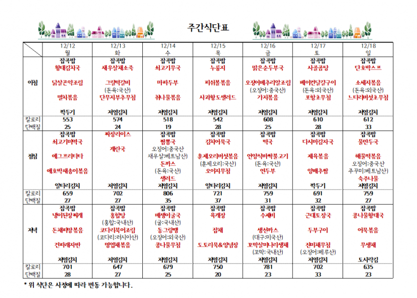12월 2째주 주간식단표 페이지 정보 작성자 김선희 댓글 0건 조회 8,375회 작성일 22-12-09 17:15 목록 본문 13일에는 입주자 기호도 반영한 짜장라이스를 지원합니다. 이전글생활재활교사 채용 공고 22.12.02 다음글11월 월간계획표 22.11.02 댓글 0 댓글목록 등록된 댓글이 없습니다.