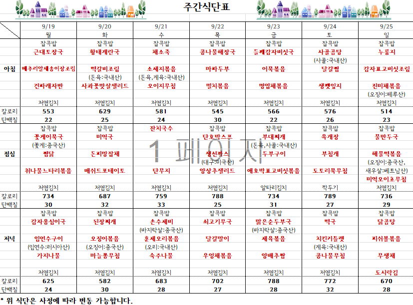 9월 3째주 주간식단표 페이지 정보 작성자 김선희 댓글 0건 조회 9,326회 작성일 22-09-16 11:06 목록 본문 21일 기호도 높은 잔치국수를 지원합니다. 이전글9월 마지막주 주간식단표 22.09.23 다음글9월 2째주 주간식단표 22.09.08 댓글 0 댓글목록 등록된 댓글이 없습니다.