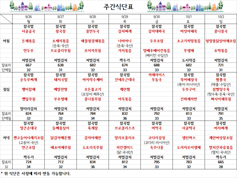 9월 마지막주 주간식단표 페이지 정보 작성자 김선희 댓글 0건 조회 9,436회 작성일 22-09-23 10:12 목록 본문 . 이전글사무원 채용 재공고 22.09.23 다음글9월 3째주 주간식단표 22.09.16 댓글 0 댓글목록 등록된 댓글이 없습니다.