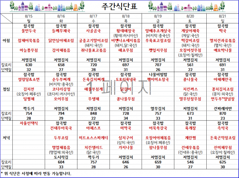 8월 3째주 주간식단표 페이지 정보 작성자 김선희 댓글 0건 조회 9,971회 작성일 22-08-16 10:06 목록 본문 19일 점심은 선호도 높은 일품 요리 비빔밥을 지원합니다. 이전글1차 서류 합격자 발표 22.09.13 다음글8월 2째주 주간식단표 22.08.08 댓글 0 댓글목록 등록된 댓글이 없습니다.