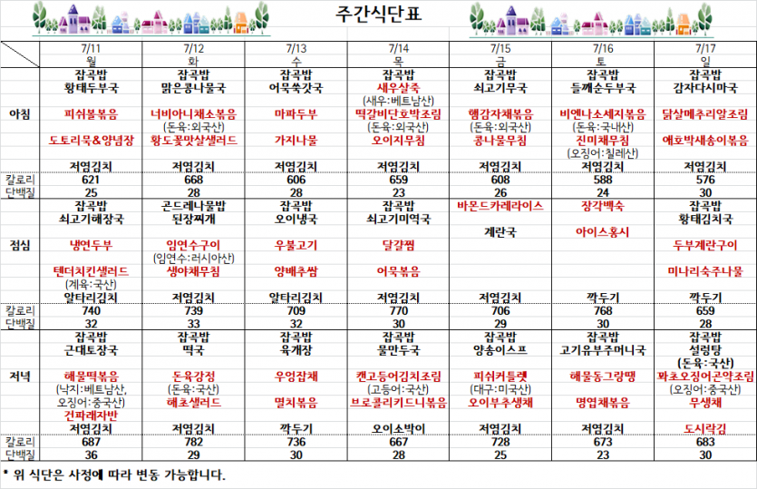 7월 2째주 주간 식단표 페이지 정보 작성자 김선희 댓글 0건 조회 10,147회 작성일 22-07-08 13:34 목록 본문 7월16일 초복 보양식으로 점심에 장각백숙 지원합니다. 이전글최종 합격자 발표(사무원, 생활재활교사, 간호조무사) 22.07.08 다음글1차 서류 합격자 발표(사무원, 간호조무사, 생활재활교사) 22.07.07 댓글 0 댓글목록 등록된 댓글이 없습니다.