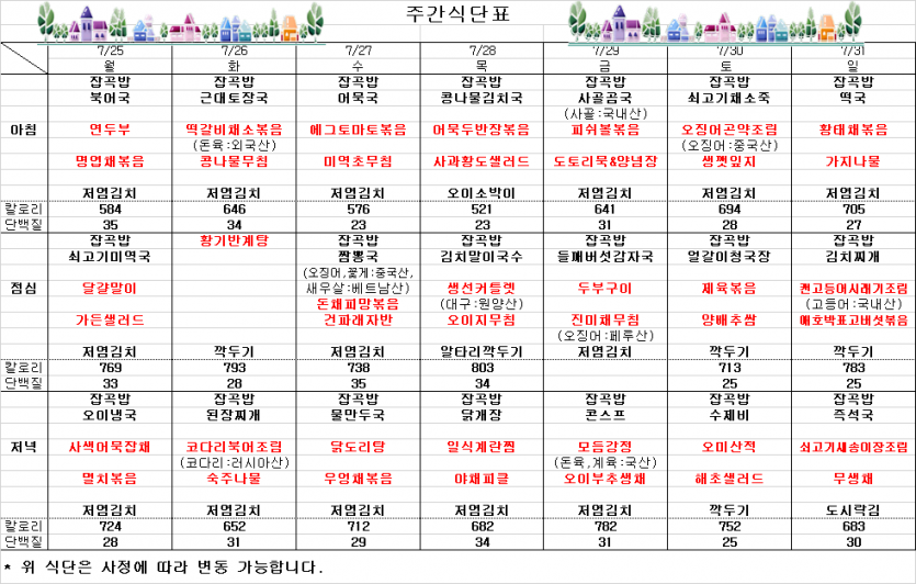 7월 마지막주 주간식단표 페이지 정보 작성자 김선희 댓글 0건 조회 10,156회 작성일 22-07-22 17:50 목록 본문 26일(중복)에는 보양식을 지원합니다. 이전글성교육 결과보고 19.03.29 다음글7월 3째주 주간식단표 22.07.18 댓글 0 댓글목록 등록된 댓글이 없습니다.