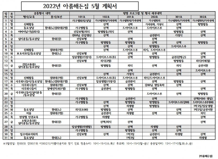2022년 5월 월간계획표 페이지 정보 작성자 장은지 댓글 0건 조회 10,069회 작성일 22-05-06 15:20 목록 본문 2022년 5월 월간계획표 이전글아름해든집 조리원 채용 재공고 22.05.11 다음글2022년 4월 월간계획표 22.04.08 댓글 0 댓글목록 등록된 댓글이 없습니다.