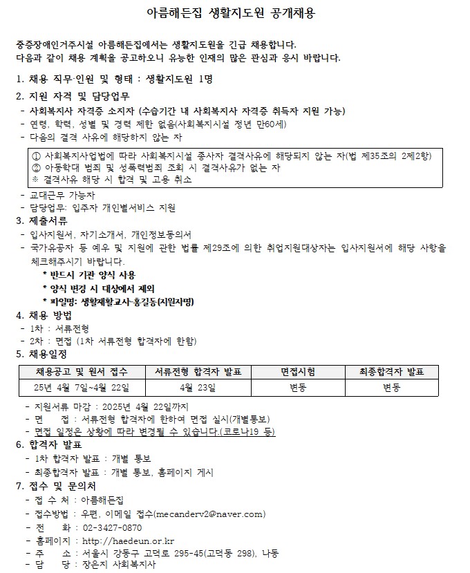 아름해든집 생활지도원 채용 공고 > 공지사항
