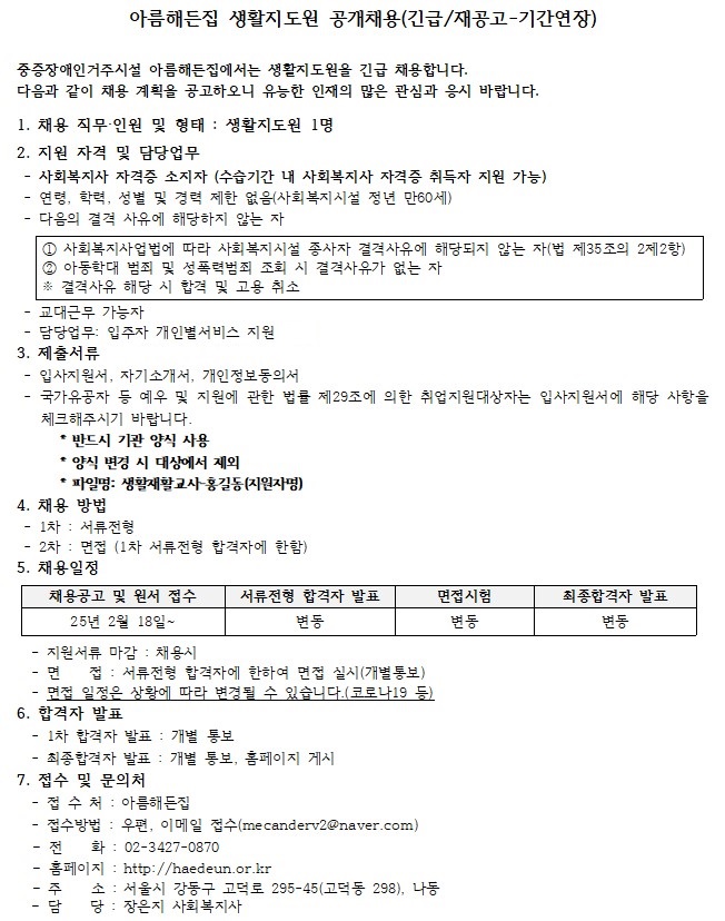 [긴급]아름해든집 생활지도원 채용 재공고-기간연장 > 공지사항